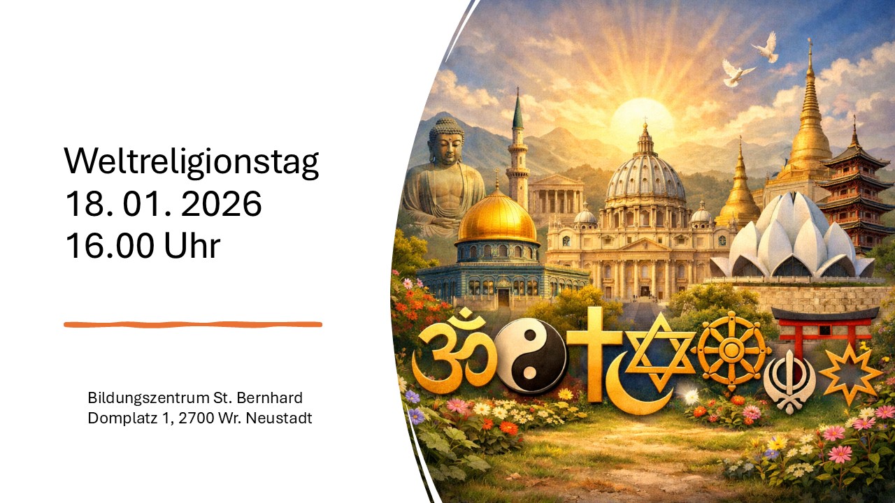 Frieden und Religionen – Hoffnung für die Welt: Religionen als Wegweiser zu Frieden und Zusammenarbeit – Ort: Bildungszentrum St. Bernhard, Beginn 16,00 bis ca. 20,00 Uhr – Programm: